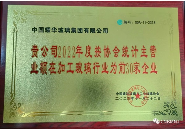 會(huì)上為加工玻璃行業(yè)30強(qiáng)企業(yè)頒發(fā)證書(shū),中國(guó)耀華玻璃集團(tuán)有限公司榮 獲“2022年度按協(xié)會(huì)統(tǒng)計(jì)主營(yíng)業(yè)額在加工玻璃行業(yè)為前30家企業(yè)”稱(chēng)號(hào),此次榮譽(yù)的獲得不僅是行業(yè)與協(xié)會(huì)對(duì)耀華集團(tuán)的肯定,更是推動(dòng)集團(tuán)前進(jìn)的動(dòng)力。